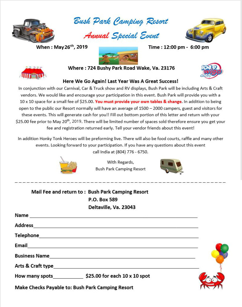 The Events Calendar provides dates and information about all the Special Happenings at Bush Park Camping Resort. Events are for campers and their guests only, unless otherwise specified.